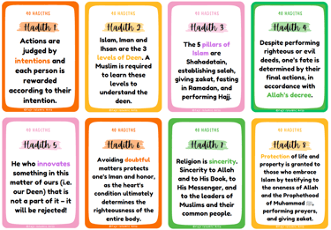 Looking for an engaging and informative way to learn and teach the 40 Hadith of Imam An-Nawawi? These 40 Hadith Lesson Cards are designed to help students of all ages grasp the wisdom of the sayings of the Prophet Muhammad (PBUH) in a visually appealing and easy-to-understand format.